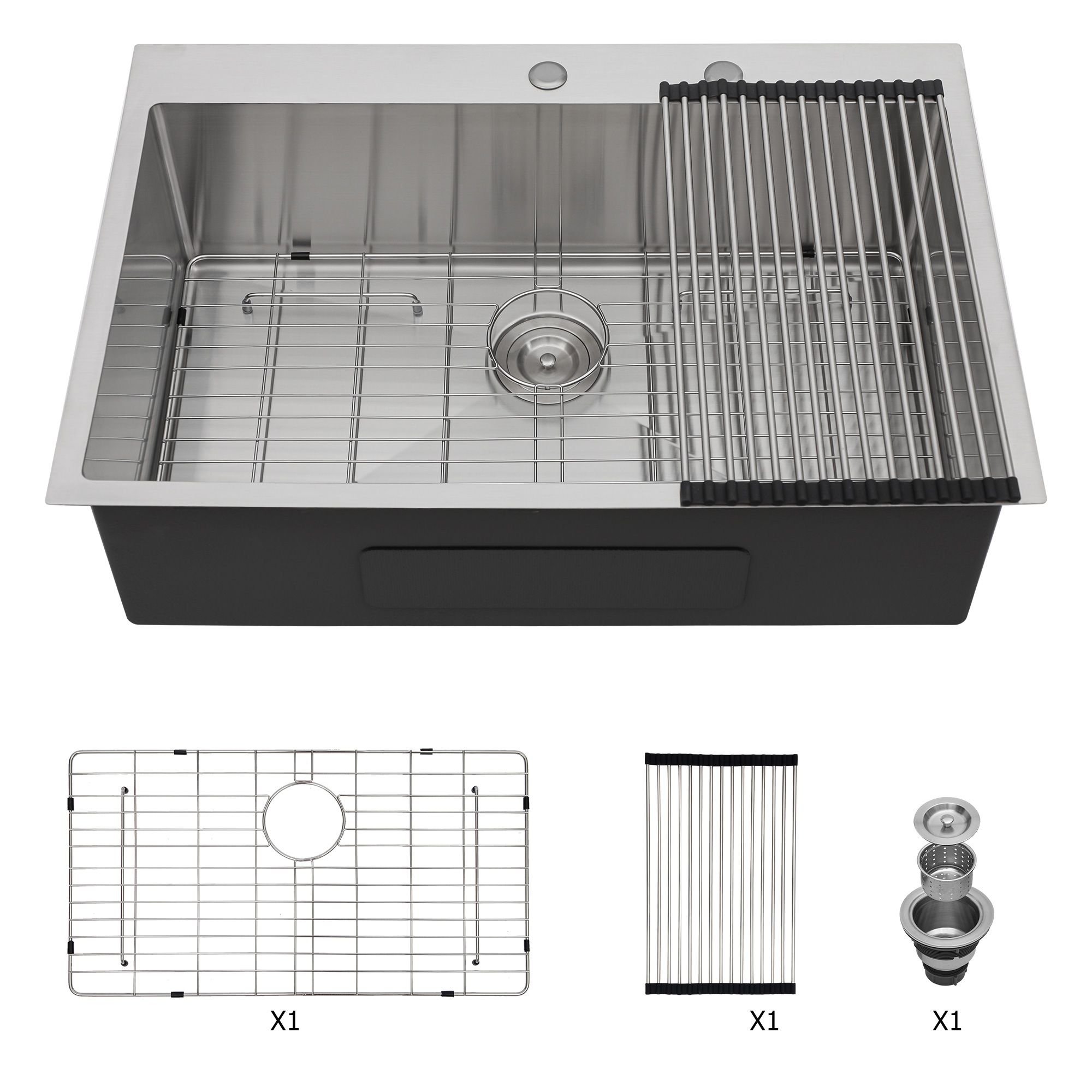 [ CUSTOMIZED PREMIUM ACCESSORIES] Comes with this kitchen sink: 1x304 stainless steel dish grid, 1 x drain assembly, 1 x drying rack,1 x pack clips, 1 x cutout template and installation instruction. R10 Round corner is designed to prevent corner rust and super easy in maintaining and cleaning.