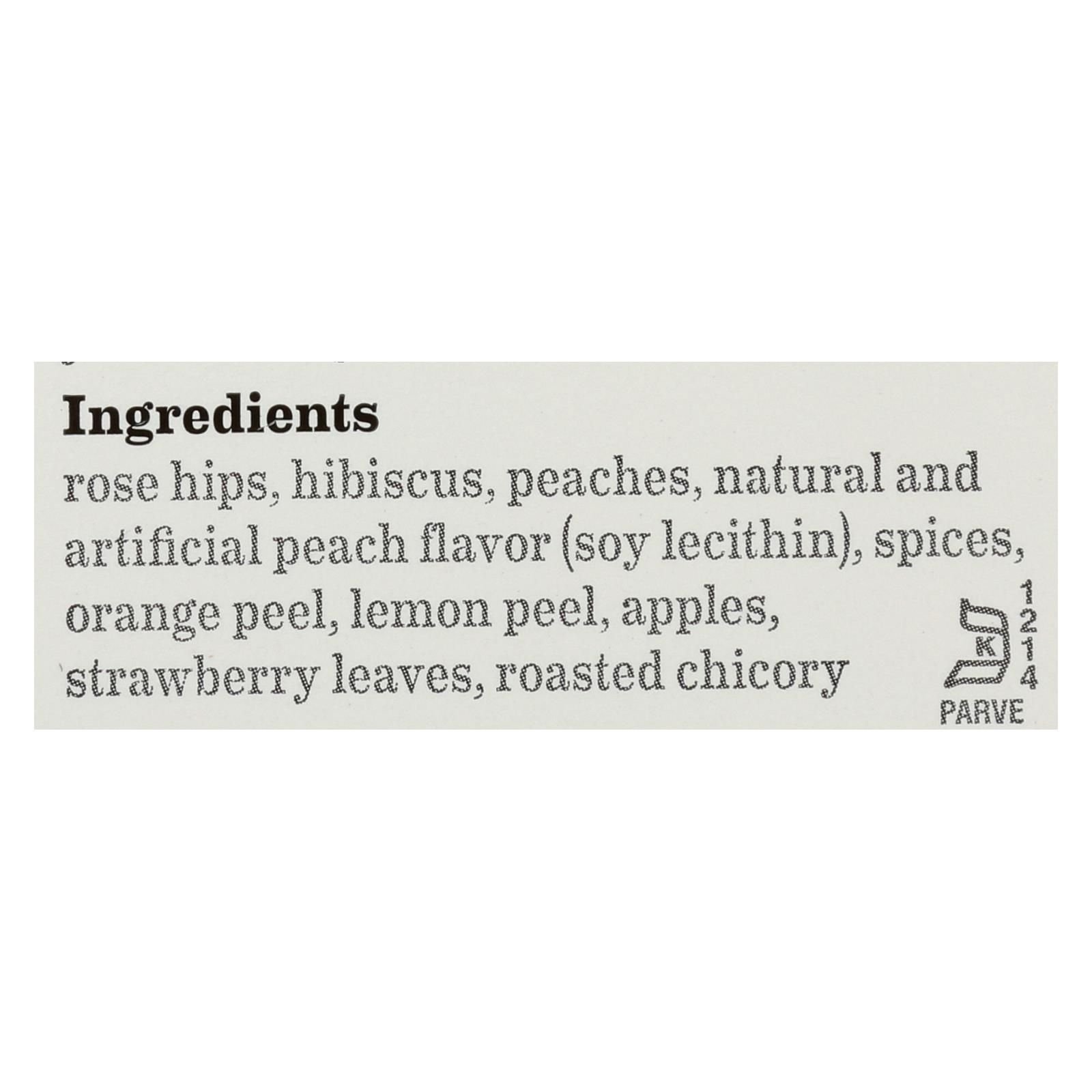 ingredients : rose hips;hibiscus;peaches;natural and artificial peach flavor;soy lecithin;spices;orange peel;lemon peel;apples;strawberry leaves;roasted chicory