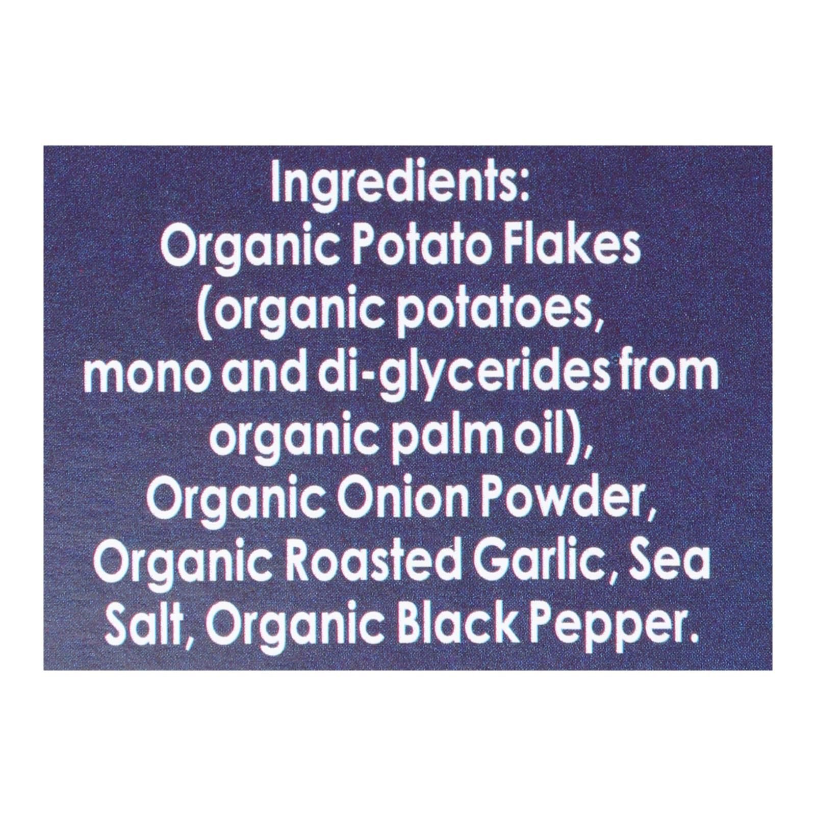ingredients : organic potato flakes;organic potatoes;mono and di-glycerides from organic palm oil;organic onion powder;organic roasted garlic;sea salt;organic black pepper