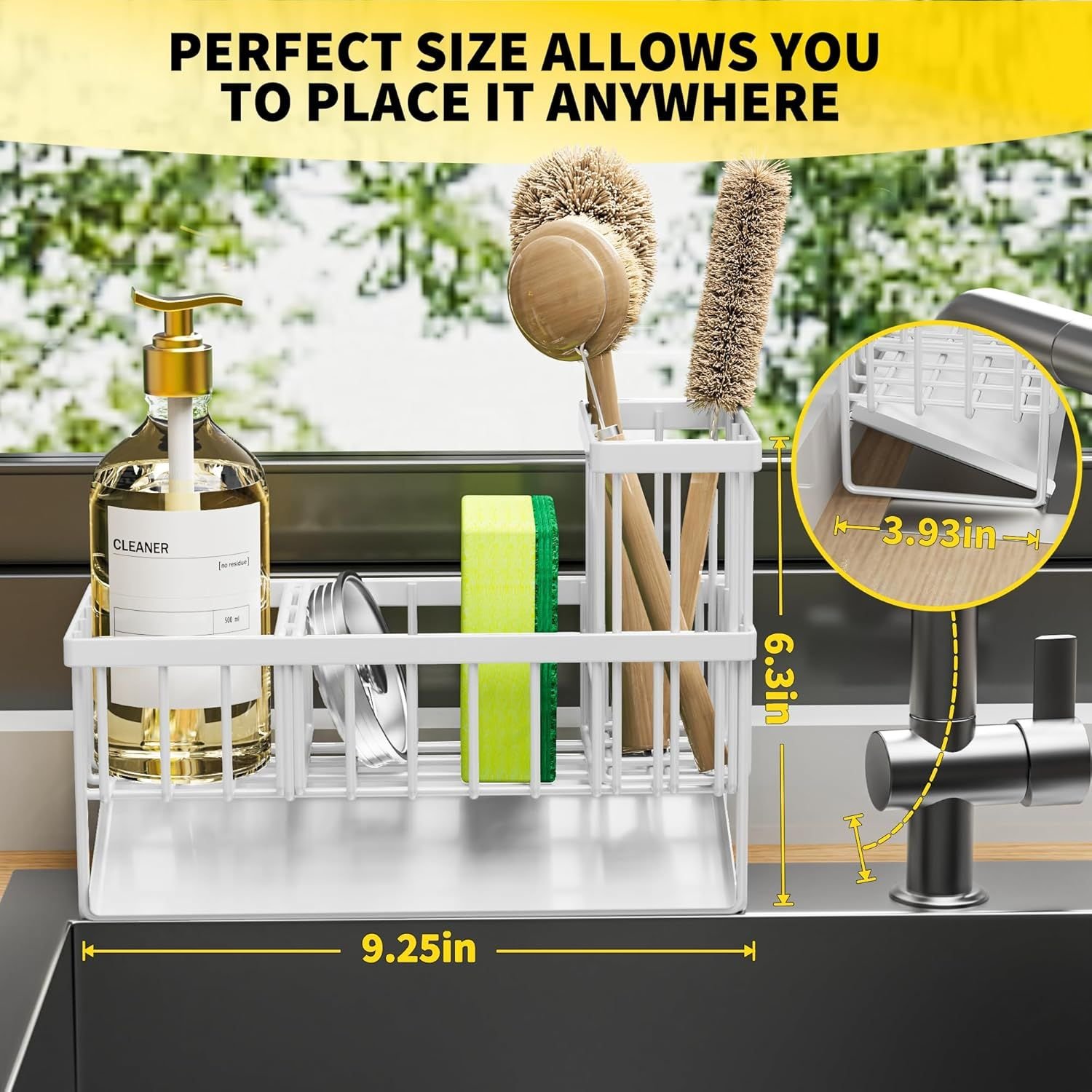 SMALL VOLUME:Sponge holder is suitable for kitchens with limited space. It measures only 9.25"*3.97"*6.37", Holds a detergent bottle, a sponge ball and sink stopper. With an extra upgraded brush holder that can hold up to 4 small and large sized brushes, with the Sink caddy you can save countertop space perfectly.
