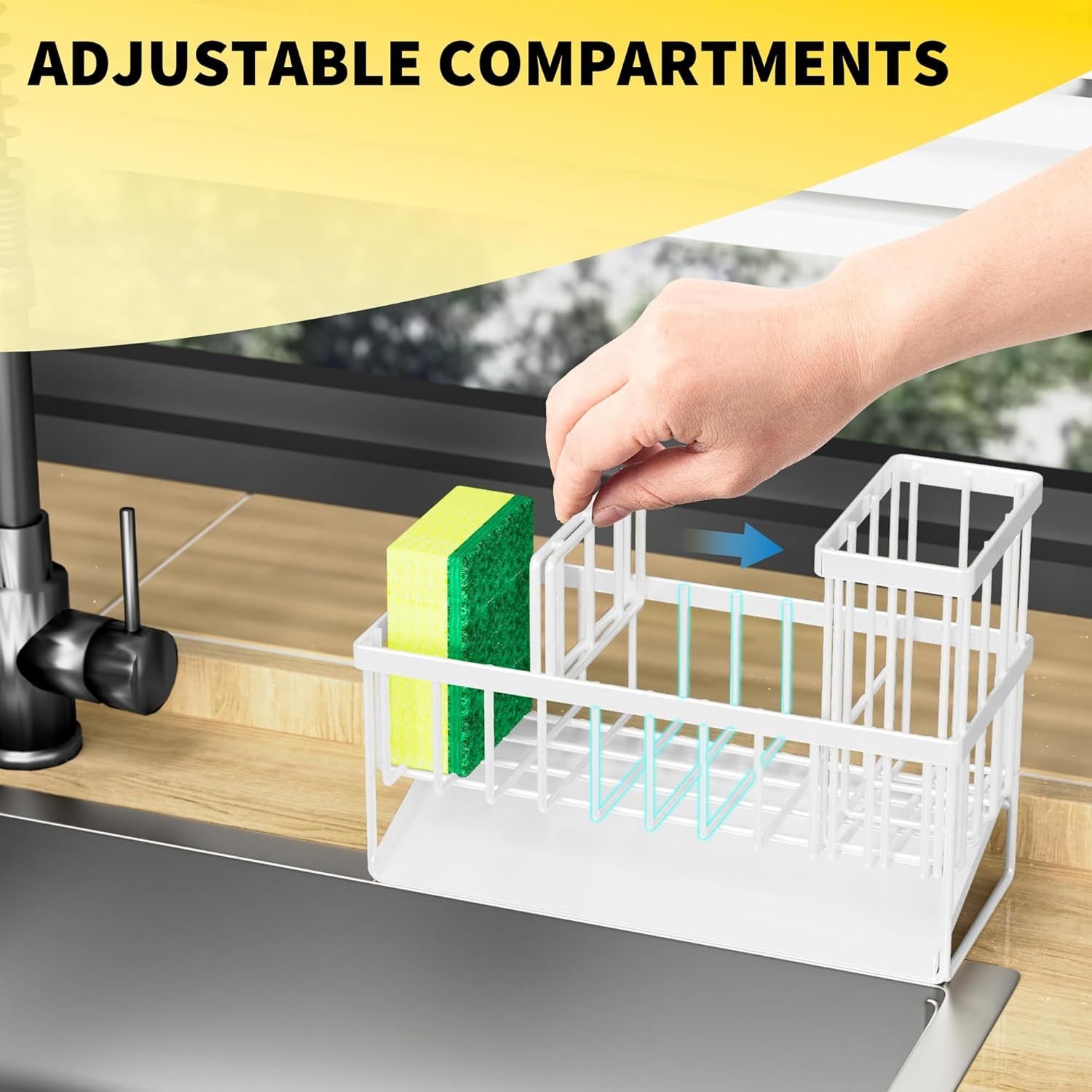 REASONABLE DIVIDER DESIGN: The sponge holder for kitchen sink ergonomic divider design allows it to have 3 separate storage spaces, Different items are placed in different areas. Make the most of every inch of space and make your kitchen look cleaner.