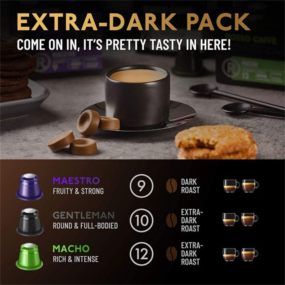 TWO SIZES - THREE FLAVORS - Our dark roast packs (60 pods or 120 pods) gives you a taste of everything so you can decide on your favorite flavor yourself. With no two espresso blends quite the same you can sample the different profiles and aromas to enjoy every day. The dark roast pack contains three bold flavors - Maestro; fruity and strong - Gentleman; round and full-bodied - and our extra dark Macho; rich and intense.