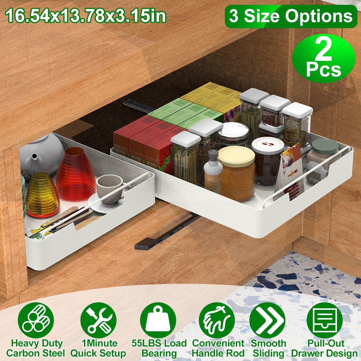 Home > 2Pcs Pull Out Cabinet Organizers Sliding Shelf Spice Rack Carbon Steel Roll Out Drawers Fixed with Adhesive Nano Film with Handle 55LBS Max Load
